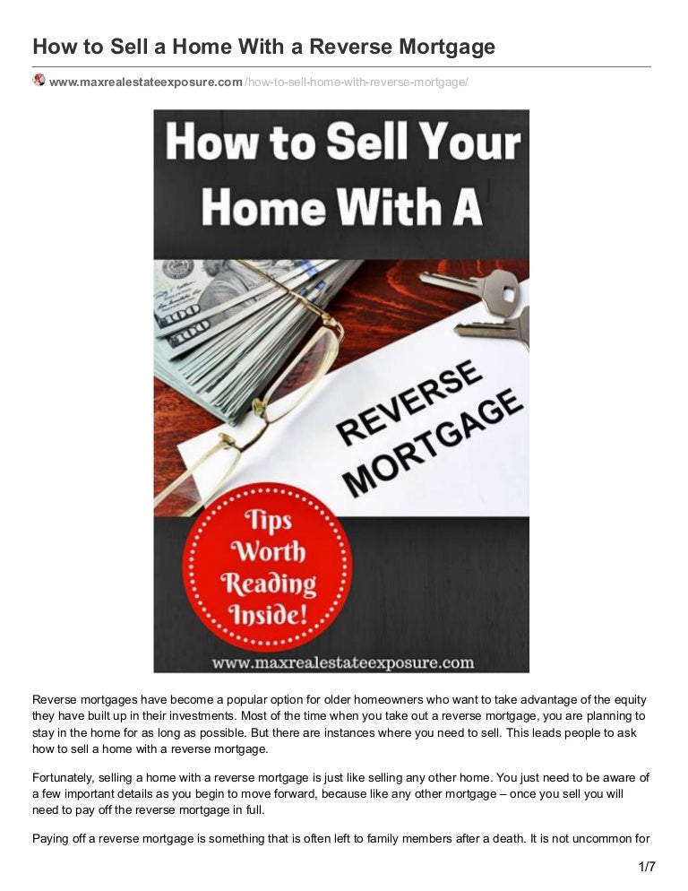 Here are a few alternatives to selling a house with a reverse mortgage. This video is a replay of a live webcast realtor® magazine presented on april 21, 2016, about selling a home that has a reverse mortgage. Similar to traditional mortgages, borrowers with reverse mortgages have the option to sell the home whenever they'd like. Before you list your house as for sale, you should know what to expect, how to sell your house after getting a reverse mortgage, and if you'll be able to walk away with any profit from the sale of your home. Yes, the process is no different.